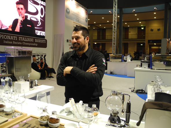 Nella sua gara, Davide ha presentato un caffè colombiano con due differenti profili di tostatura, che una volta uniti si bilanciavano e completavano. Ha fatto il parallelo e “trattato” il caffè come un buon vino, da degustare con cura in un calice, “avvinandolo” (bagnandolo con il caffè che ha rilasciato il suo aroma) prima di versare il suo drink. Infine parliamo con Simone Dessì, che si è classificato decimo nella gara baristi. La sua prova si è svolta nel segno della semplicità, attorno alle quattro parole che per lui meglio identificano l’espresso: cultura, tecnica, semplicità e precisione. Qualcosa non ha funzionato in fase di estrazione e il prodotto in tazza è risultato eccessivamente amaro. Non se ne duole: il prossimo anno starà più attento”