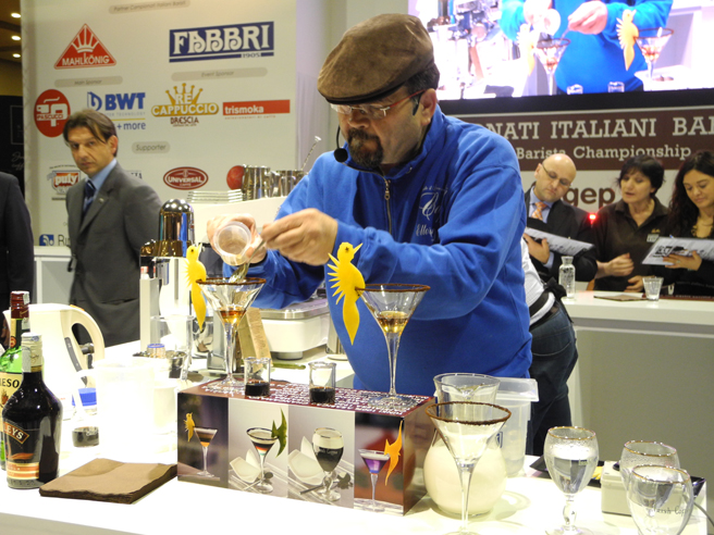 Asachimici è stata vicina a numerosi finalisti delle appassionanti gare che si sono svolte a Rimini. A cominciare da Ettore Diana, un barman di lungo corso, grande appassionato di caffè. Ha al suo attivo un ricco medagliere di vittorie conquistate a colpi di shaker (l’ultimo trofeo è quello di primo classificato, categoria Fancy, all’Iba World Cocktail Championsip nel 2012 a Pechino) ed anche di espresso: ha vinto il campionato italiano “Coffee in Good Spirits” nel 2008 e nel 2010. A Rimini si è classificato terzo nella stessa specialità con il drink Mandela, dedicato a chi si è sempre battuto per l’uguaglianza tra bianchi e neri. E, sopra le gocce di miele poste sul fondo della doppia coppetta Martini, a rappresentare il sole dell’Africa, il drink a strati a visto sovrapporsi componenti chiari e scuri. La sua attività di consulente e formatore è intensa; qual è il rapporto tra il barista e la pulizia delle macchine? gli chiediamo. “Raccolgo le confidenze, i pensieri e le richieste di baristi di tutta Italia e verifico una presa di coscienza nei confronti della pulizia delle apparecchiature. Un tempo mi sentivo dire “tanto la macchina il caffè lo fa lo stesso”, ma ora si cerca sempre più la perfezione, la bontà in tazza e una macchina sporca non può dare risultati eccellenti.