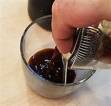 • Estrarre un espresso e versarlo in un bicchiere con molto ghiaccio, raffreddarlo velocemente e filtrarlo con uno strainer nella tazza di vetro, in alternativa utilizzate 50ml di Cold Brew