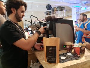 Allo stand Faema il Barista Trainer Davide Roveto gentilmente ci ha presentato la E71e mentre estrae con attenzione la nostra miscela LAB100, la musica di sottofondo rende l’idea dell’atmosfera festiva che c’era all’evento anche se sfortunatamente copre un po’ la voce di Davide e per questo ci scusiamo..