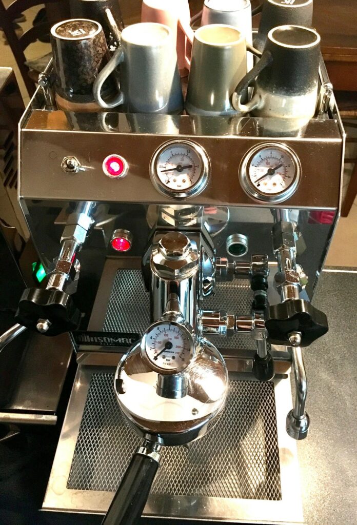 Questa macchina ha soltanto 6 anni di vita ed è stata appena revisionata: pulizia interna delle caldaie, sostituzione di resistenza, pompa, elettrovalvola, termostato, manometro. Ho sostituito anche il regolatore della pressione, in modo da renderla più facilmente settabile rispetto alla versione originale. In questi anni ha sempre lavorato con acqua filtrata, regolarmente pulita e periodicamente decalcificata.