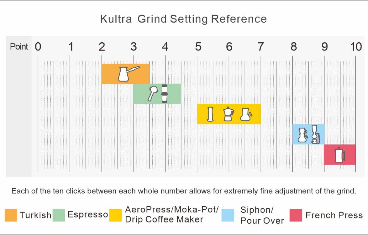 Il meccanismo di regolazione di K-Ultra è più fine rispetto ad altri macinini della linea. Ci sono 10 numeri/100 clic in una rotazione e la bava si sposta di 20 micron per clic.